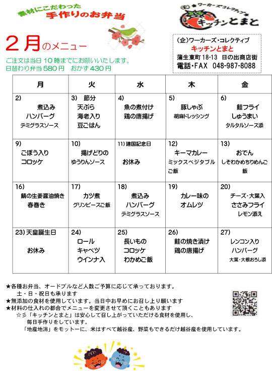 「ワーカーズ・コレクティブ キッチンとまと」は、可能な限り地場産の農作物を使用して、安全・安心なお弁当を届け、誰でもが高齢になっても働く場としていきたいと願っています。